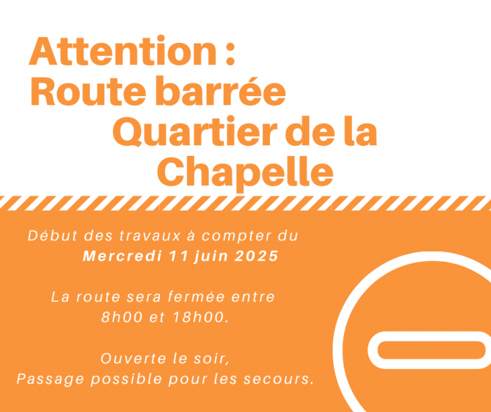 Route barrée dans le quartier de la chapelle à compter du 11 juin 2025, Merci pour votre compréhension.