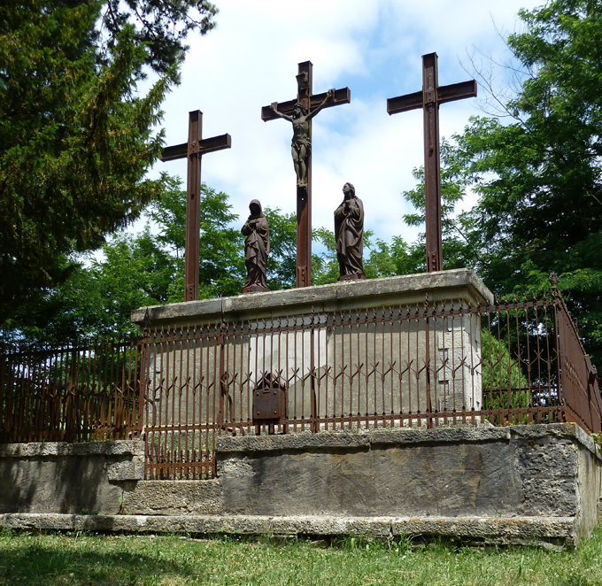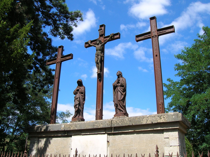 Deux statues sont placées de part et d'autre de la croix centrale. Elles représentent deux femmes, l'une couverte d'un voile, l'autre la tête nue. S'agit-il de la représentation de la Vierge Marie et de Sainte Madeleine?