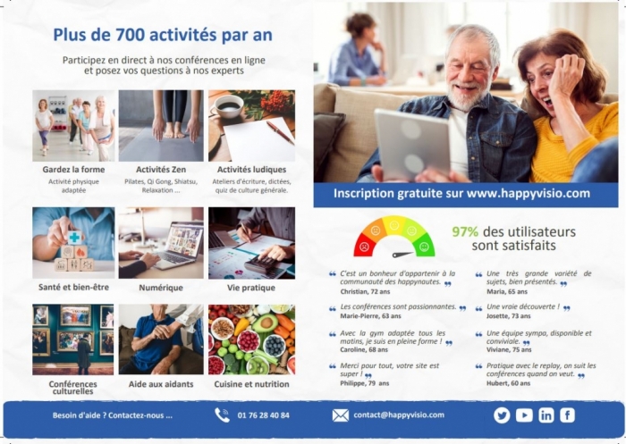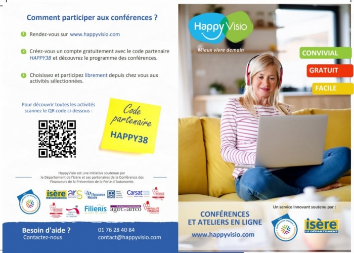 Happy Visio est une plateforme innovante d’information et de formation en visioconférence, à destination des seniors mais pas que ! HappyVisio propose des conférences pour les seniors et des ateliers Internet. Des activités à suivre en direct depuis son domicile et durant lesquelles les participants peuvent interagir et poser leurs questions aux experts.