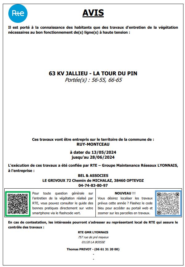 Rte vous informe que, conformément aux dispositions de l'article 12 de la Loi du 15 juin 1906 sur les distributions d'énergie et de l'arrêté du 17 mai 2001 relatif aux conditions techniques auxquelles doivent satisfaire les lignes de transport et de distribution électrique, des travaux d'élagage et d'abattage vont être entrepris prochainement sur le territoire de Ruy-Montceau, afin d'assurer le bon fonctionnement des lignes hautes tension mais également la sécurité des personnes aux abords de ces ouvrages.