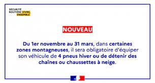 A compter du 1er novembre 2021, la nouvelle réglementation pour les zones montagneuses va entrer en vigueur avec l'obligation d'équipement des véhicules en période hivernale.