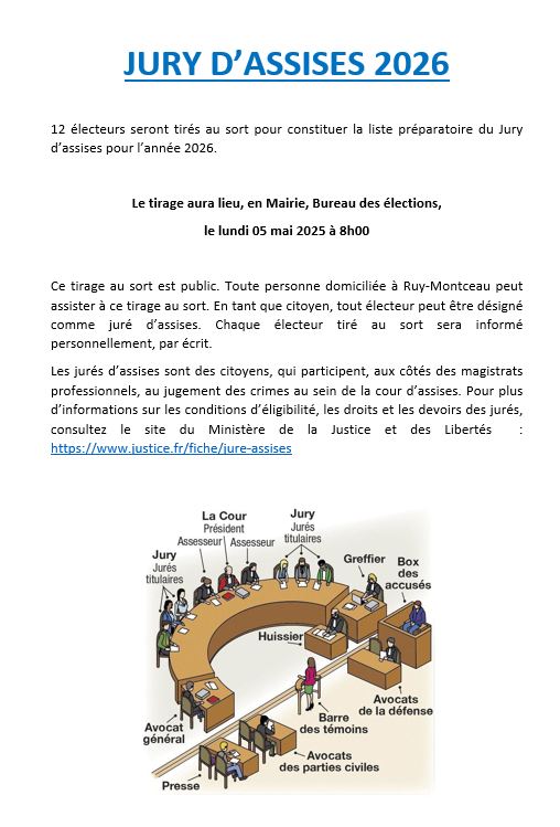 Jury d'assises 2026, le tirage au sort aura lieu le Lundi 5 mai 2025 à 8h00 en mairie, bureau des élections.